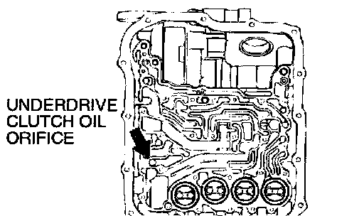 2) Blow 108 kPa (15 psi) compressed air into the underdrive clutch oil orifice of the transaxle case, and check if the underdrive clutch piston moves and air pressure is maintained in that condition.