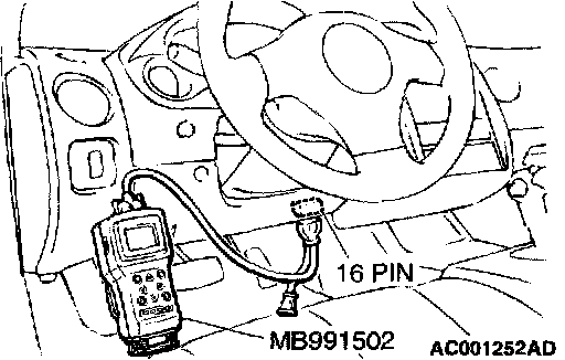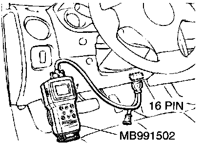 CAUTION: To prevent damage to scan tool MB991502, always turn the ignition switch to the "LOCK" (OFF) position before connecting or disconnecting scan tool MB991502.