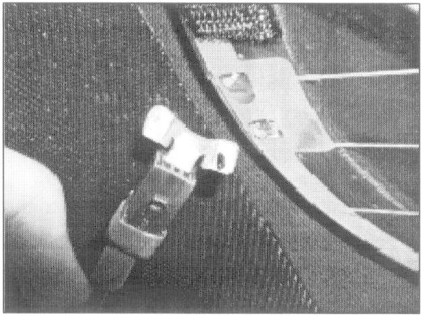 8. Remove the tape after the adhesive has cured for the required time. Check the defogger wire harness routing to make sure there is no binding which might pull the defogger wire or tab, then reattach the defogger wire.