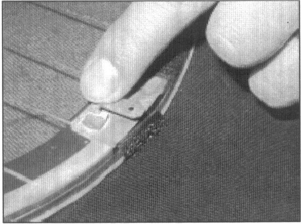 6. Place the tab onto the adhesive. DO NOT ATTACH THE DEFOGGER WIRE AT THIS TIME. THE ADHESIVE MUST CURE FIRST. Position the terminal so the connector tab points away from the grid (toward the outside edge of the glass).