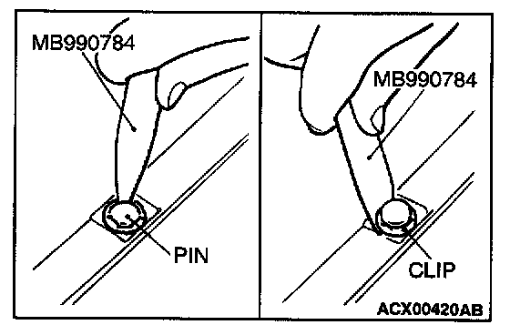 1. Use special tool MB990784 to pull up the center pin in the clip.