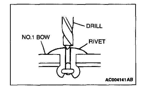 Use a drill [psi 4.0 - 4.5 mm (psi 0.16 - 0.18 inch)] to break the rivet by drilling a hole, and remove the rivet.
