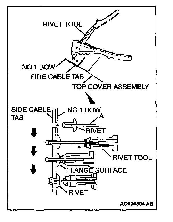 1. Insert the rivet [psi 4.8 mm (psi 0.19 inch)] into the No.1 bow and side cable tab.