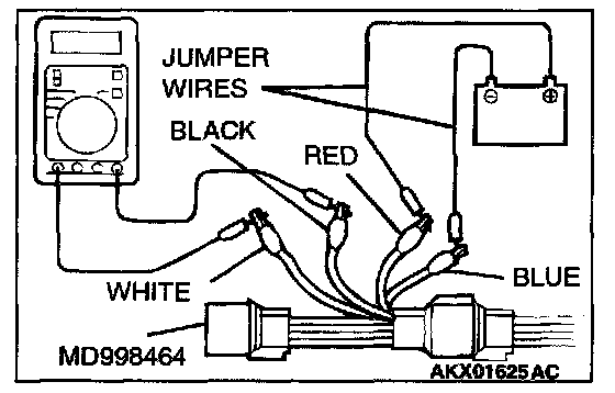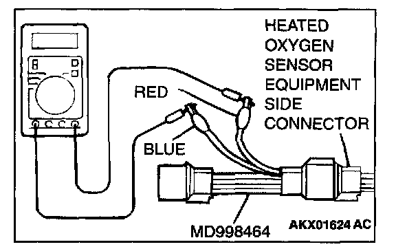 1. Disconnect the heated oxygen sensor connector and connect special tool MD998464 to the connector on the heated oxygen sensor side.