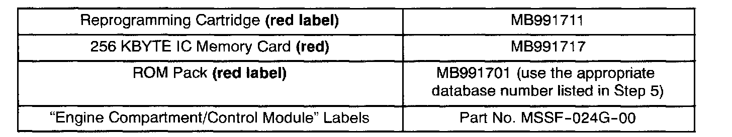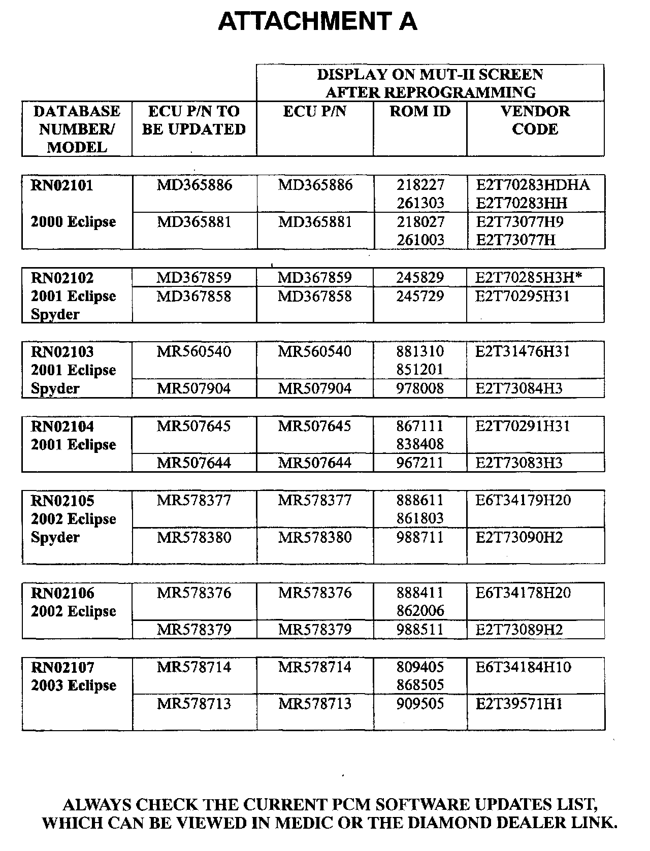 To verify that the correct reprogramming has been made, the ROM ID number will display on the MUT-II screen. Note this number. The table in Attachment A lists the ECU part numbers and ROM ID numbers that should display after reprogramming, and their corresponding vendor numbers.