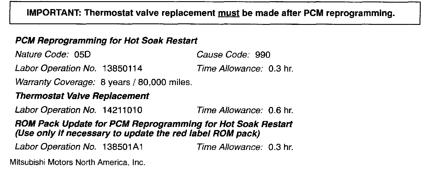 To eliminate this condition, reprogram the PCM and replace the thermostat valve as described in this bulletin. Refer to the PARTS INFORMATION section of this bulletin for the replacement thermostat part number.