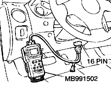 CAUTION: To prevent damage to scan tool MB991502, always turn the ignition switch to the "LOCK" (OFF) position before connecting or disconnecting scan tool MB991502.