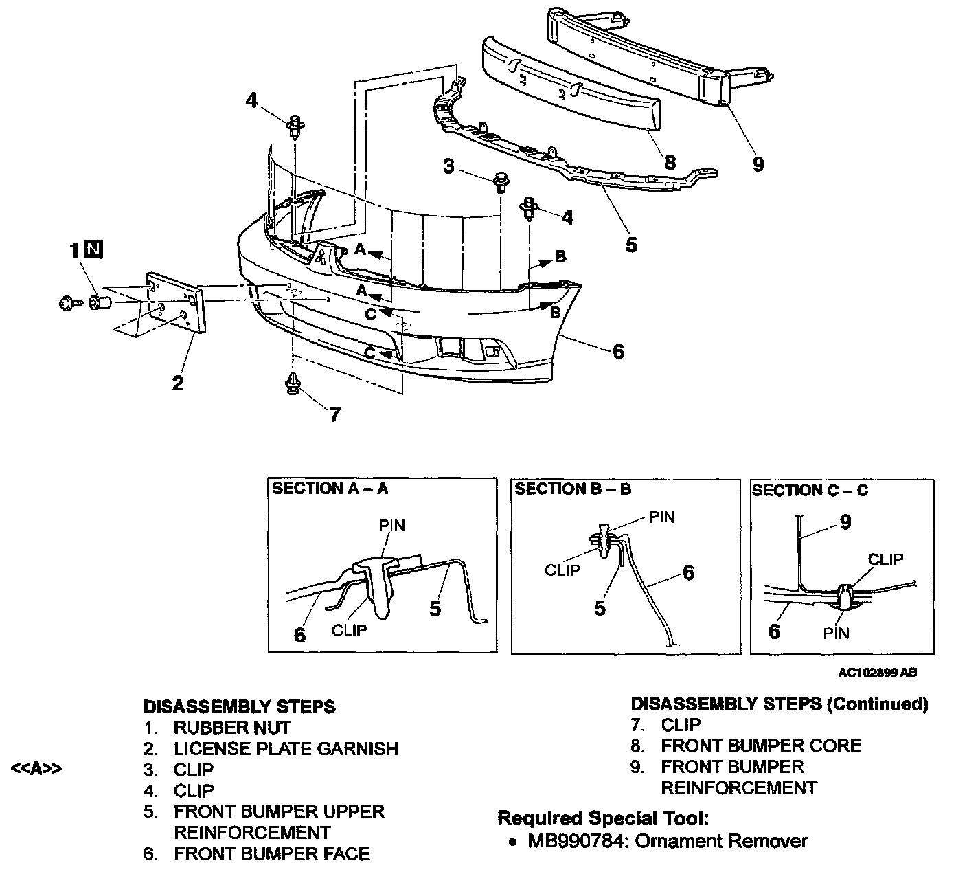 Use special tool MB990784 to pull up the center pin in the clip.