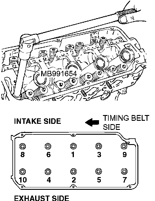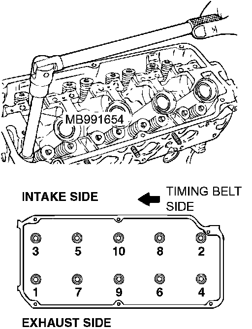 Using special tool MB991654, loosen the bolts in two or three steps in the order of the numbers shown in the illustration, then remove the cylinder head assembly.