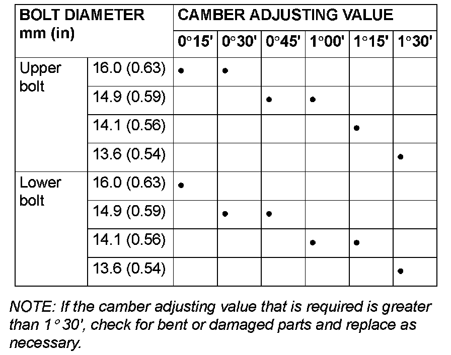 NOTE: If the camber adjusting value that is required is greater than 1° 30', check for bent or damaged parts and replace as necessary.