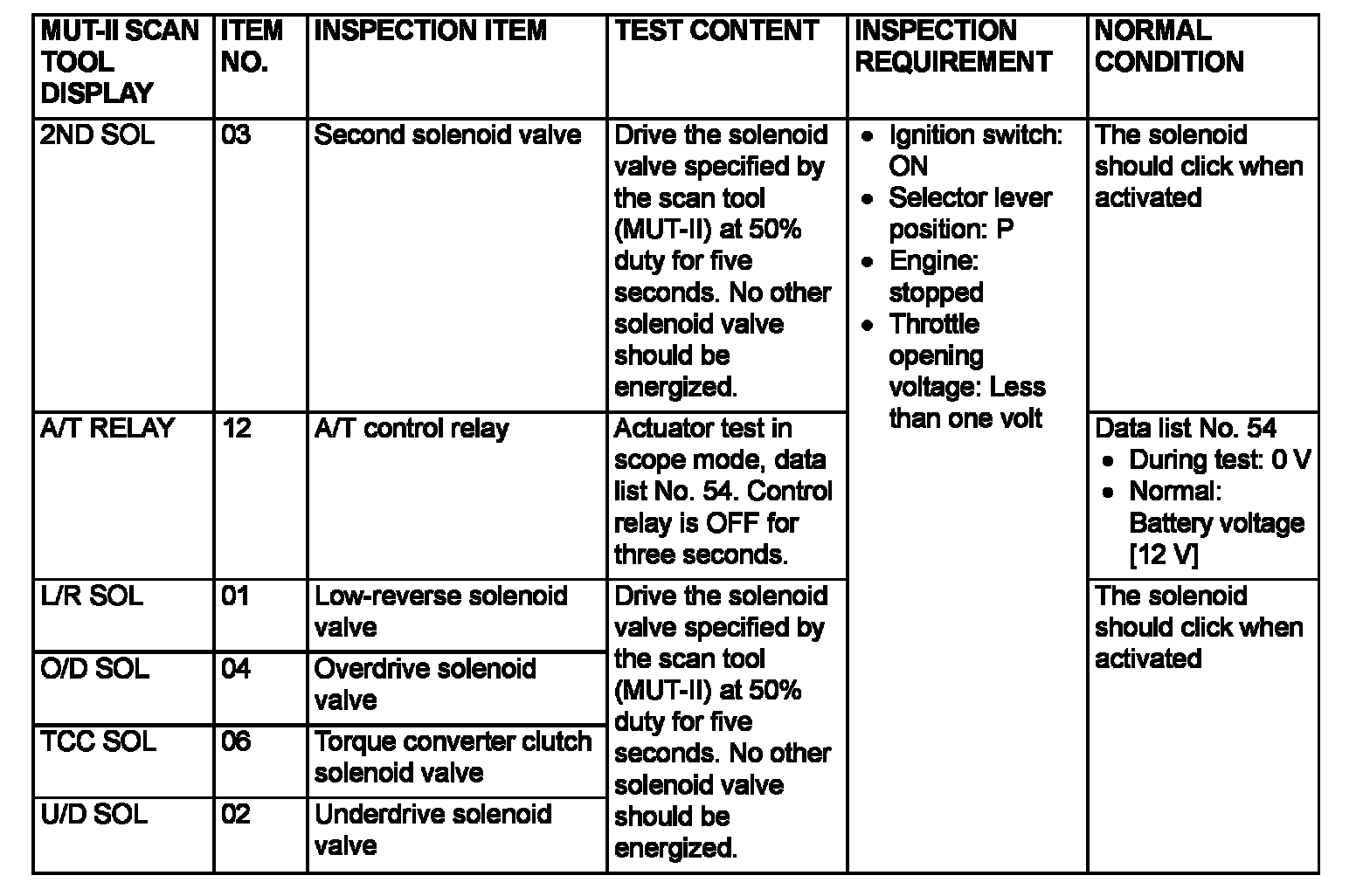 Actuator Test Reference Table