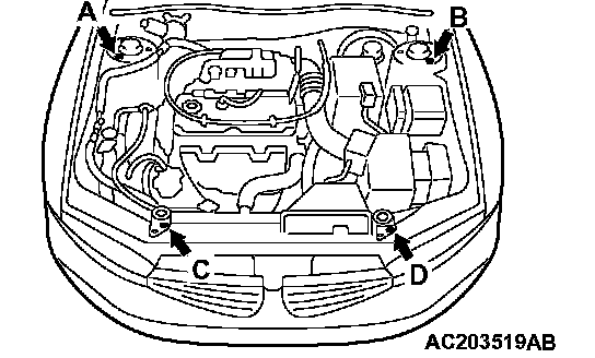 1) Set special tool MB991895 to the strut assembly mounting nuts (A and B) and the radiator support upper insulator mounting bolts (C and D), which are located in the engine compartment, as shown.