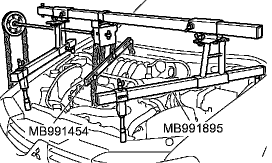 2) Set special tool MB991454 to hold the engine/transaxle assembly.