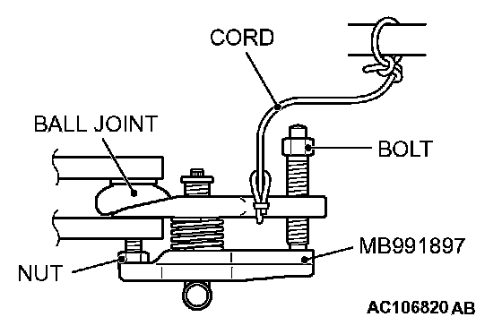 ^ Do not remove the nut from ball joint. Loosen it and use special tool MB991897 to avoid possible damage to ball joint threads.