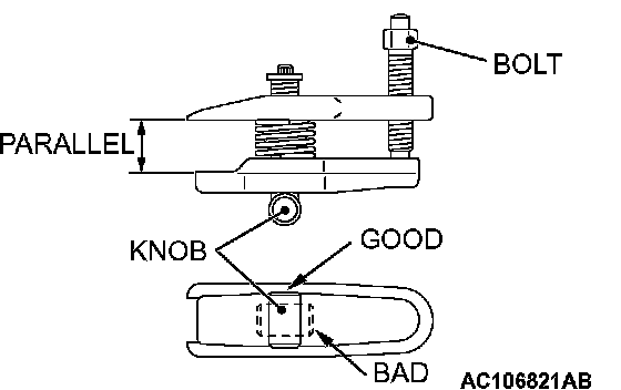 2. After turning the bolt and knob to adjust the insert arms of the special tool MB991897 in parallel, tighten the bolt by hand and confirm that the insert arms are parallel.