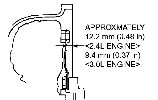 Insert the torque converter into the transaxle oil pump until the dimension is Approximately 12.2 mm (0.48 inch) <2.4L ENGINE>, Approximately 9.4 mm (0.37 inch) <3.0L ENGINE>. Install the transaxle assembly to the engine.