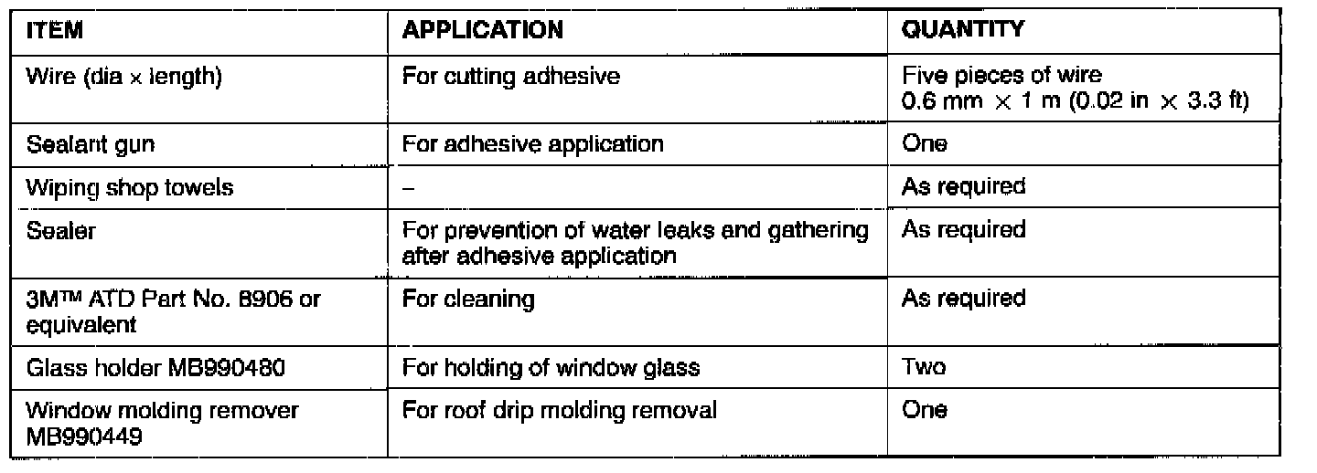 GENERALThe windshield and rear window glass are attached by an urethane-base adhesive to the window frame. This adhesive provides improved glass holding and sealing, and also permits use of body openings having a greater structural strength.