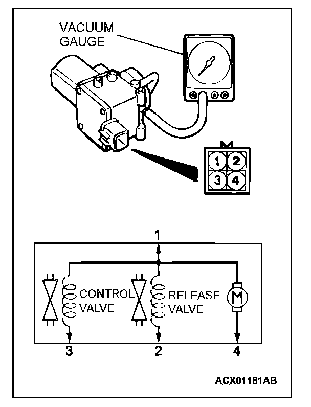 1. Connect the positive battery terminal to auto-cruise vacuum pump connector terminal 1, and the negative battery terminal to terminals 2, 3, and 4. Then the vacuum gauge should read greater than 27 kPa (8.0 inHg).