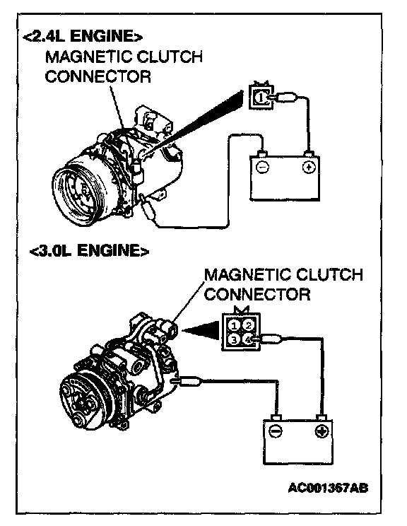 Connect the battery (+) terminal to the compressor magnetic clutch connector terminal 1 <2.4L engine> or terminal 4 <3.0L engine>, and ground the battery (-) terminal to the body of the compressor. The condition is normal if the sound of the magnetic clutch (click) can be heard.