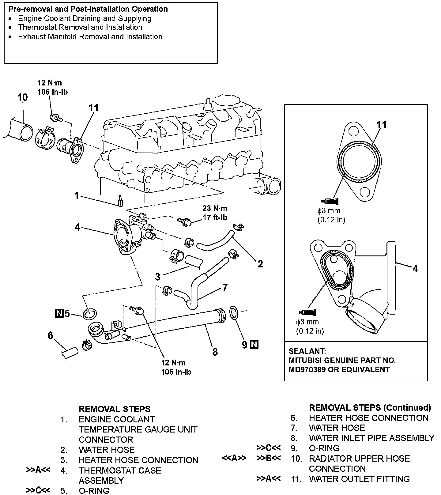 Apply a continuous bead of MITSUBISHI GENUINE Sealant Part number MD970389 or equivalent to the thermostat housing mating surface.