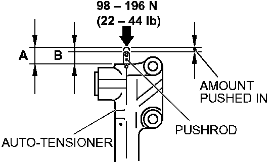 1. While holding the auto-tensioner with your hand, press the end of the push rod against a metal surface (such as the cylinder block) with a force of 98 - 196 N (22 - 44 pound) and measure how far the pushrod is pushed in.