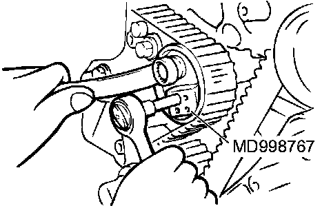 4. Use special tool MD998767 to push the tensioner pulley into the timing belt, then temporarily tighten the center bolt.