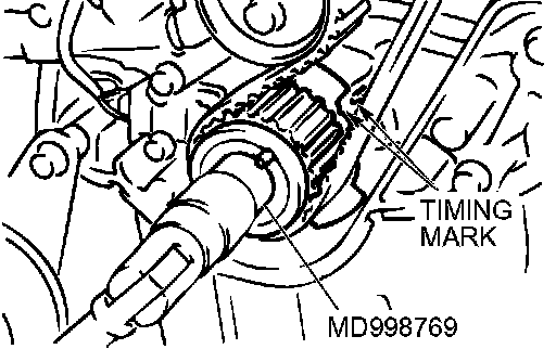 5. Use special tool MD998769 to turn the crankshaft 1/4 turn counterclockwise, then turn it again clockwise until the timing marks are aligned.