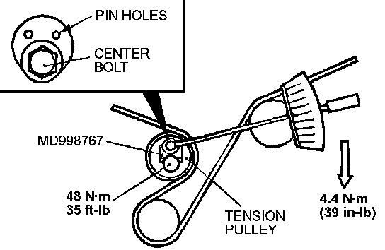 6. Loosen the center bolt of the tensioner pulley. Use special tool MD998767 and a torque wrench to apply the tension torque to the timing belt as shown in the illustration. Then tighten the center bolt to the specified torque.