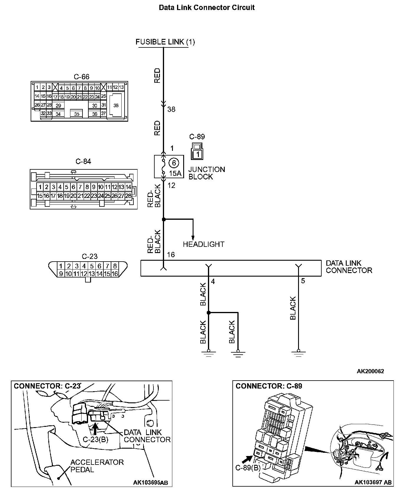 NO: Check harness connectors C-66, C-84 and C-89 at intermediate connector for damage, and repair or replace as required. Refer to Harness Connector Inspection. If intermediate connectors are in good condition, repair harness wire between fusible link 1.and data link connector C-23 (terminal No. 16) because of open circuit. Then confirm that the malfunction symptom is eliminated.