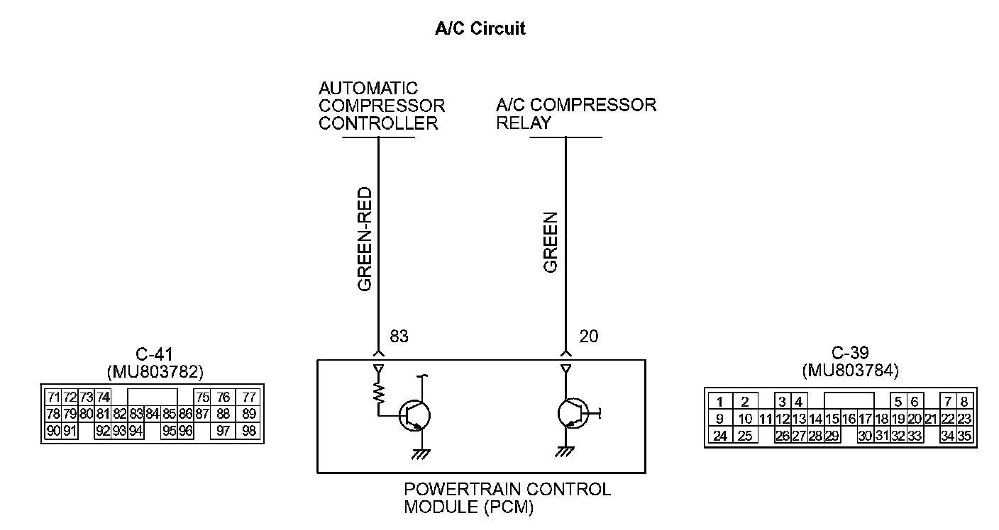 - When the A/C is "ON", the battery positive voltage is applied on the PCM (terminal No. 83) from the automatic compressor controller. When battery positive voltage is applied to the PCM, the PCM turns "ON" the power transistor in the PCM. The PCM delays A/C engagement momentarily while it increases idle r/min. Then the A/C compressor clutch relay coil will be energized.
