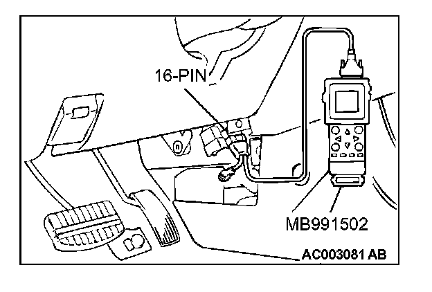 CAUTION: To prevent damage to scan tool MB991502, always turn the ignition switch to the "LOCK" (OFF) position before connecting or disconnecting scan tool MB991502.