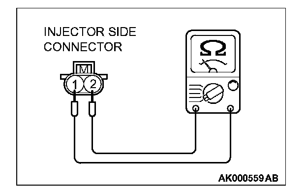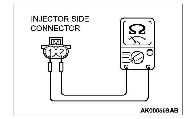 3. Measure the resistance between injector side connector terminals No. 1 and No. 2.