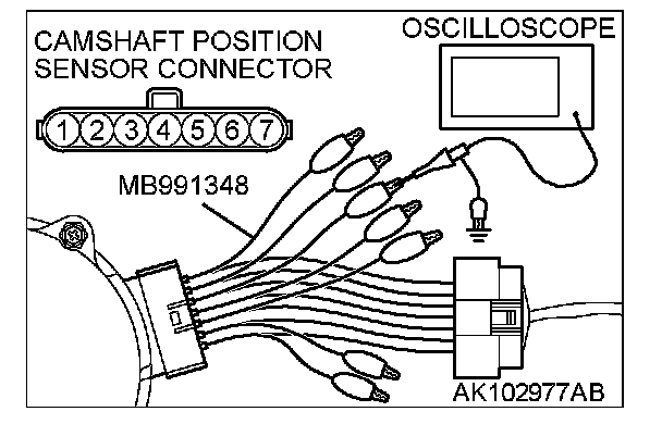 1. Disconnect the camshaft position sensor connector, and connect the test harness special tool (MB991348) in between. (All terminals should be connected.)