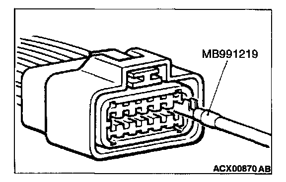 Use special tool, MB991219, to inspect the engagement of the male pins and female pins. [Pin drawing force: 1 N (0.2 pound) or more]