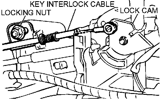 4) Disconnect the key interlock cable from the shift lock cable retaining shaft on the lock cam. Loosen the lock nut on the key interlock cable housing mounting bracket.
