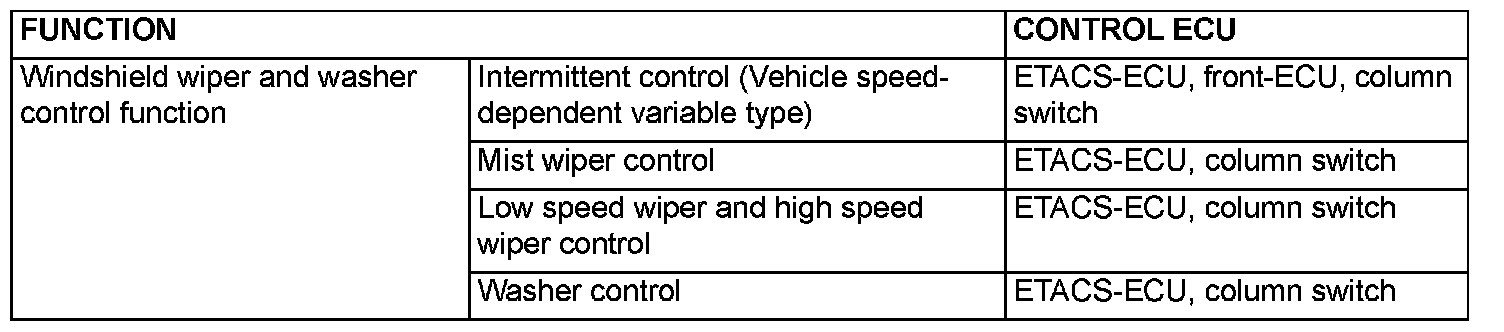 The ETACS-ECU calculates the intermittent time according to the vehicle speed calculated from the windshield wiper intermittent time adjusting knob and vehicle speed signal (PCM) and sends it to the front-ECU as SWS data.