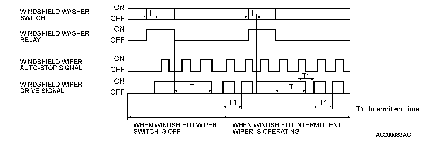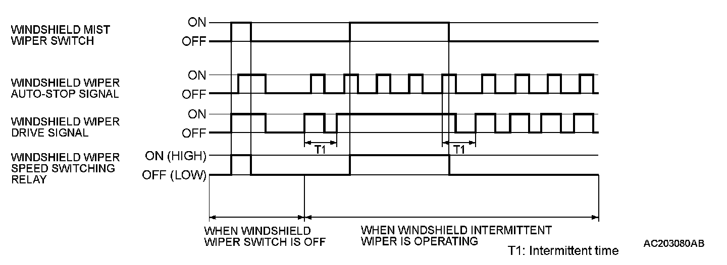 At the point the windshield mist switch is turned ON, if the windshield wiper has been operating intermittently, the same operations as the above will be performed while the windshield mist wiper switch is ON. After the windshield mist wiper switch goes OFF, the intermittent operations will be set again T1 seconds after the windshield wiper auto-stop signal is turned ON last.
