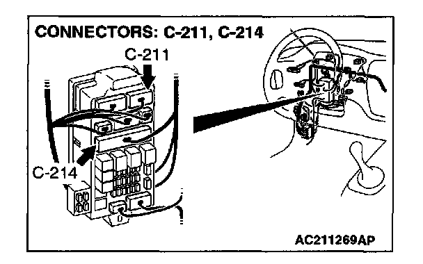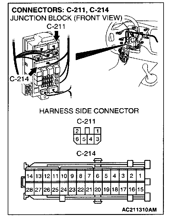 NOTE: Also check junction block connectors C-214 and C-211 for loose, corroded, or damaged terminals, or terminals pushed back in the connector. If junction block connectors C-214 and C-211 is damaged, repair or replace the connector as described in Harness Connector Inspection.