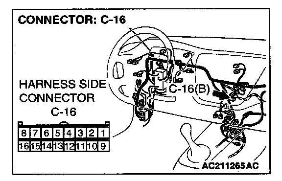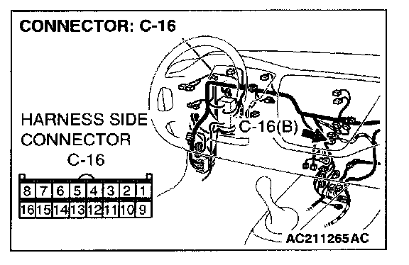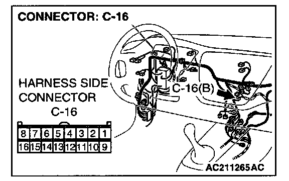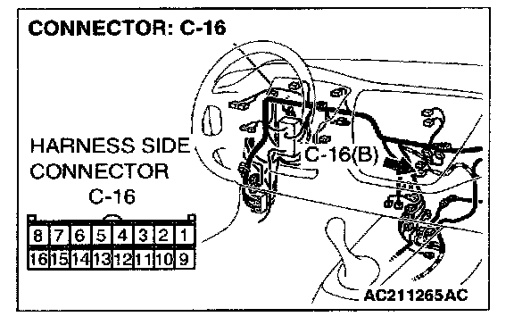 1. Disconnect A/C-ECU connector C-16 and measure the voltage at the harness side.