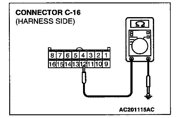 STEP 6. Check the wiring harness between A/C-ECU connector C-16 (terminal 12) and the ground.