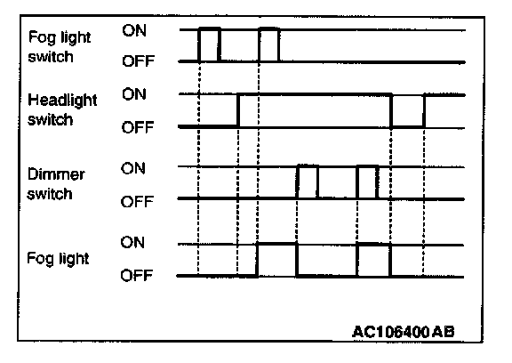 If the ETAS-ECU sends a fog light "ON" request signal to the front-ECU after the low-beam headlights are on, the fog light relay is turned on, allowing the fog lights and the fog light indicator light to be illuminated. If the low-beam headlights are turned off, the fog lights will also be turned off automatically. Therefore, when the headlights are turned on at next opportunity, the fog lights will not illuminate. If the high-beam headlights are turned on while the fog lights are on, the fog lights will be turned off. Then, if you switch the headlights from the high-beam to the low-beam, the fog lights will be turned on again.