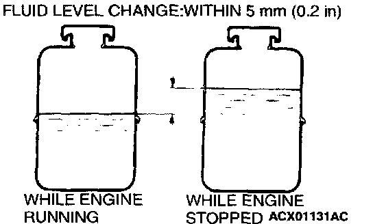4. Check the fluid in the oil reservoir for foaming or milkiness. Check the difference of the fluid level when the engine is stopped, and while it is running. If the fluid contains air or has milky appearance, or the fluid level fluctuate by 5 mm (0.2 inch) or more, power steering system air bleeding should be done.