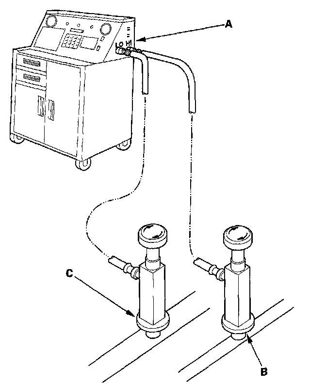 1. Connect a R-134a refrigerant recovery/recycling/charging station (A) to the high-pressure service port (B) and the low-pressure service port (C), as shown, following the equipment manufacturer's instructions.