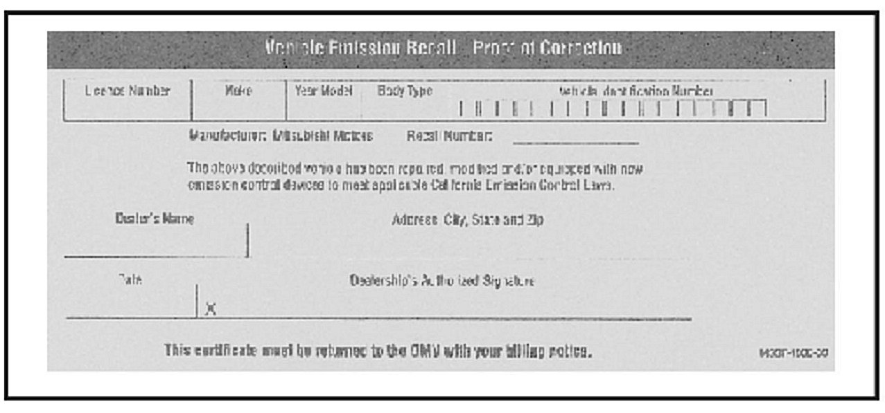 17. FOR VEHICLES REGISTERED IN CALIFORNIA ONLY: Complete a "VEHICLE EMISSION RECALL - PROOF OF CORRECTION" form (p/n MSSF-106D-00). Give the completed form to the vehicle owner.