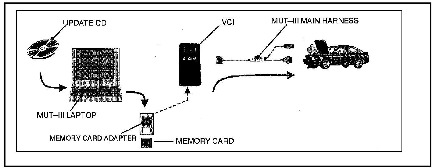 9. Remove the memory card from the laptop and install it in the VCI. Connect the VCI to the vehicle. YOU MUST DISCONNECT THE MUT-III LAPTOP.