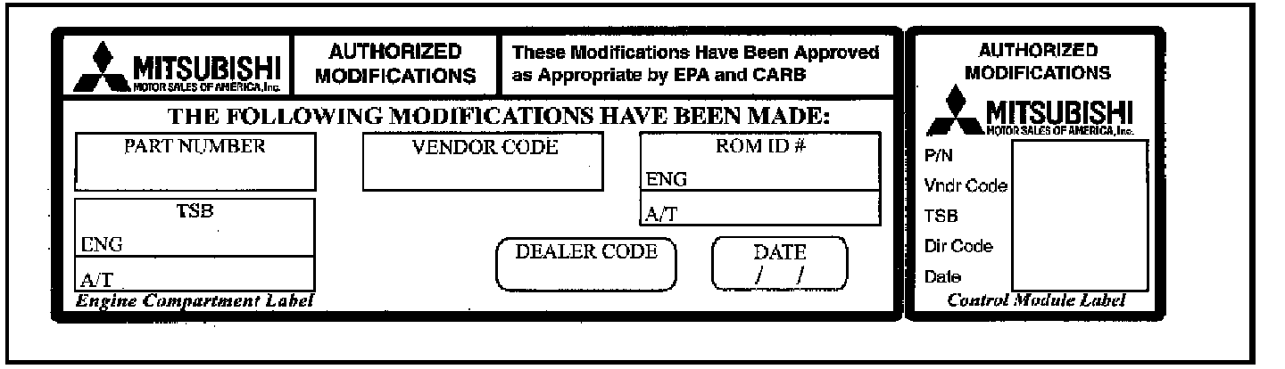 13. Using a ball-point pen, enter the appropriate PCM part number, vendor number, ROM ID #, this recall bulletin number (EMR-05-001), your dealer code, and the current date on the Engine Compartment / Control Module Label (p/n MSSF-024G-00).