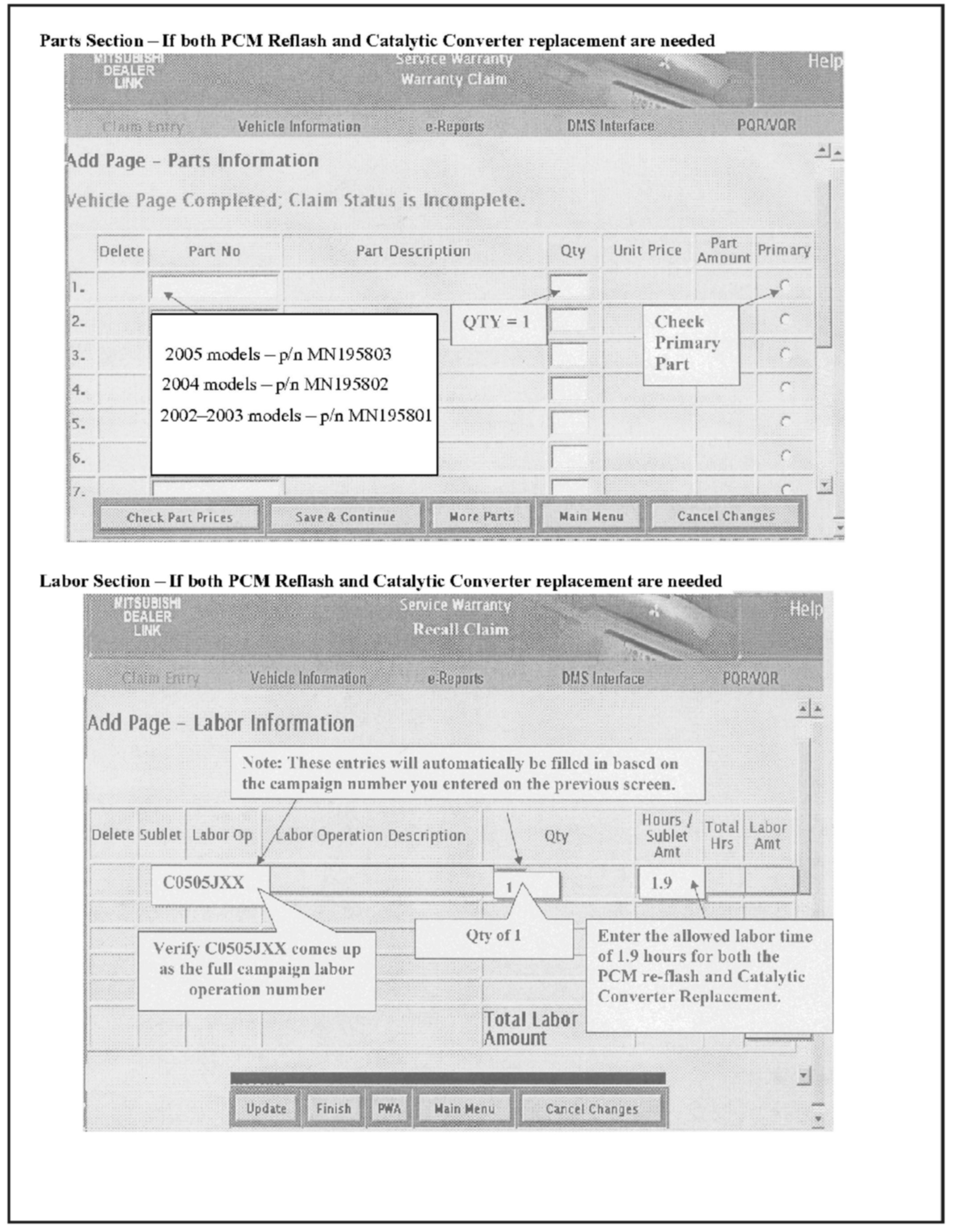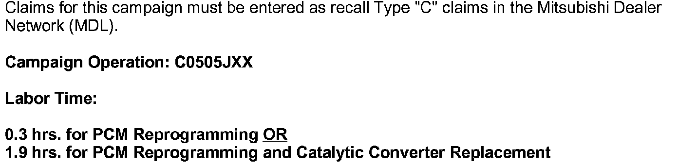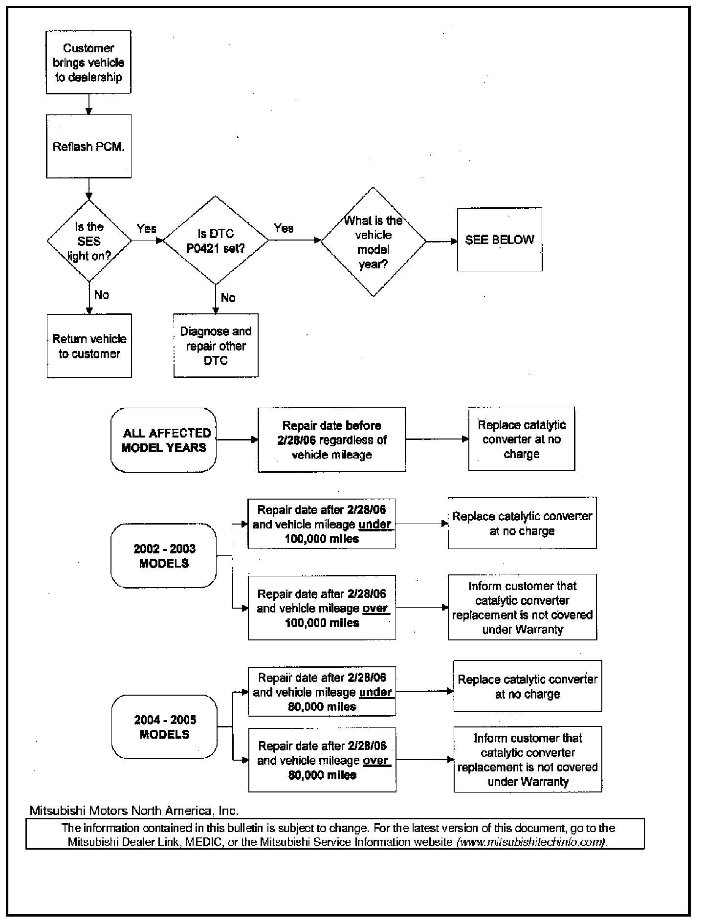 A letter will be sent to all owners of affected vehicles, telling them to bring their vehicle to a Mitsubishi Motors dealer to have the PCM reprogrammed at no charge, and that if their vehicle has a SES lamp on for failure of the warm-up catalytic converter (DTC P0421), they will also receive a new warm-up catalytic converter.