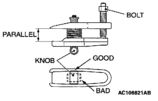 2. Turn the bolt and knob as necessary to make the jaws of the special tool MB991897 parallel, tighten the bolt by hand and confirm that the jaws are still parallel.