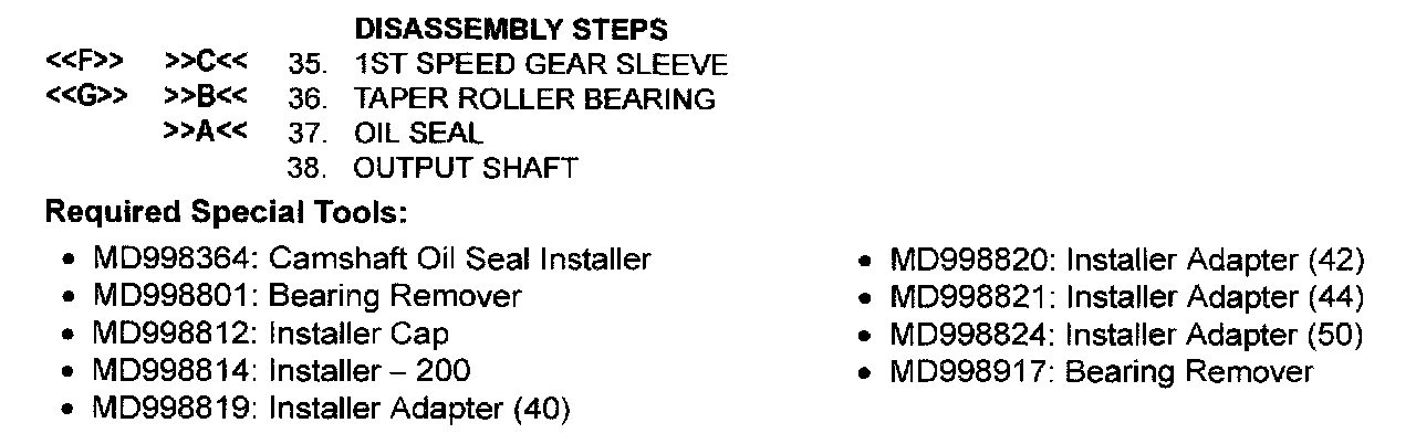 Using special tools MD998812, MD998813, MD998821 and MD998364, press install the 5th speed gear sleeve onto the output shaft.