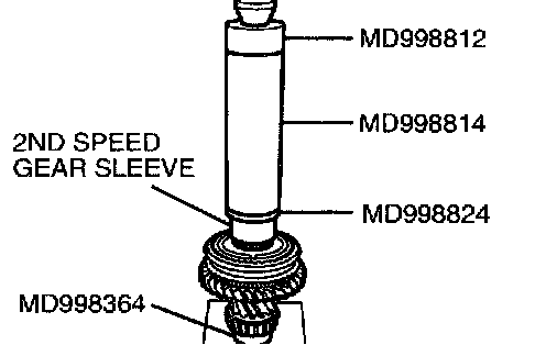 2. Using special tools MD998812, MD998813, MD998824 and MD998364, press install the 2nd speed sleeve onto the output shaft.